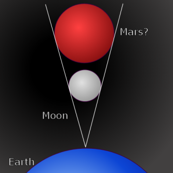 In the picture you can see (roughly) the scaled sizes of Mars and the moon. Surprisingly, mars is only twice as big in diameter as the moon. (The distances are not on the same scale as the sizes, since that would result in a picture with a cone almost too narrow to see.)