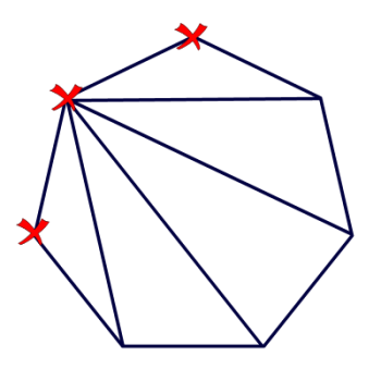 If you look at the diagram to the right, you'll see that I've marked three vertices with an X. Why? Because those are the vertices we can't draw a diagonal to. You can't draw a diagonal from a vertex to itself, and you can't draw a diagonal from a vertex to its neighboring vertex. After all, drawing a line between two neighboring vertices isn't drawing a diagonal; it's drawing a side!